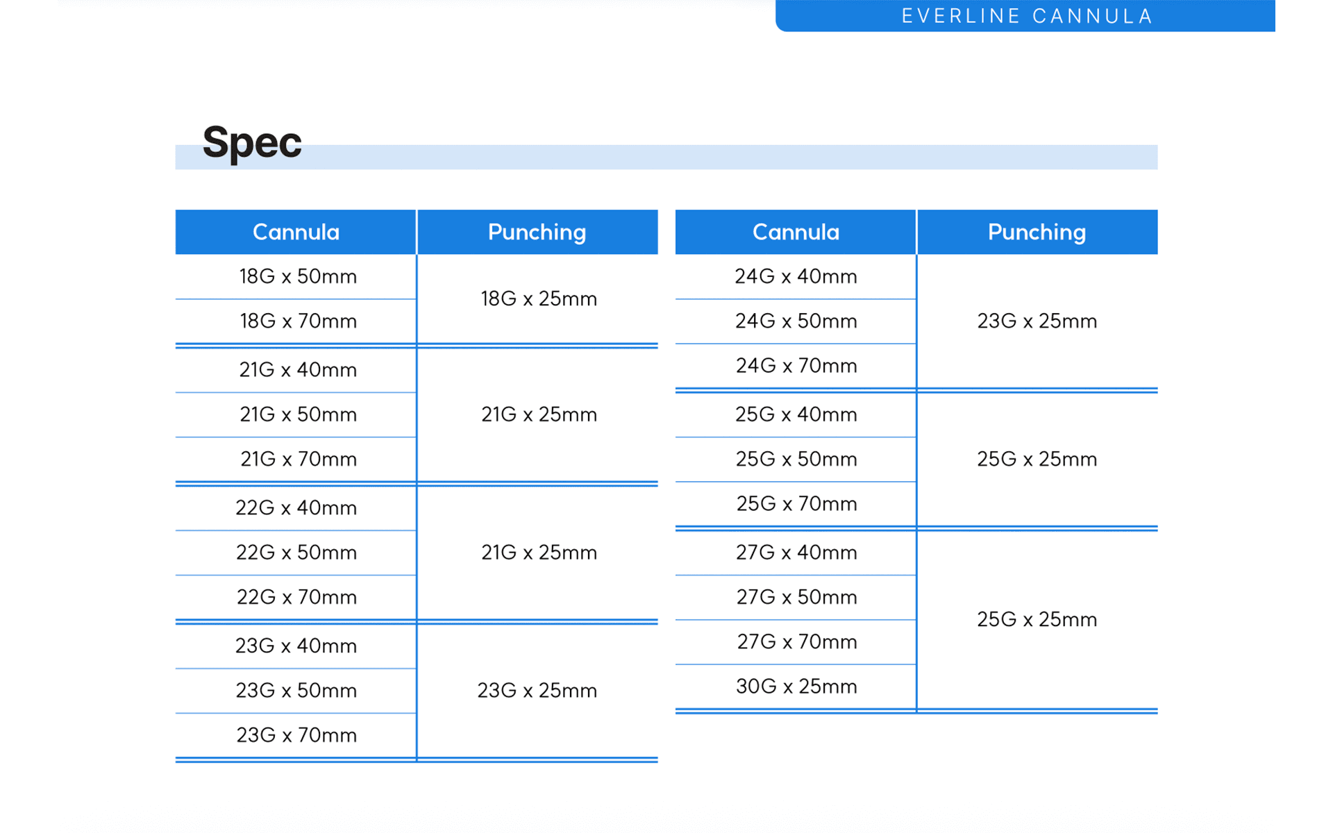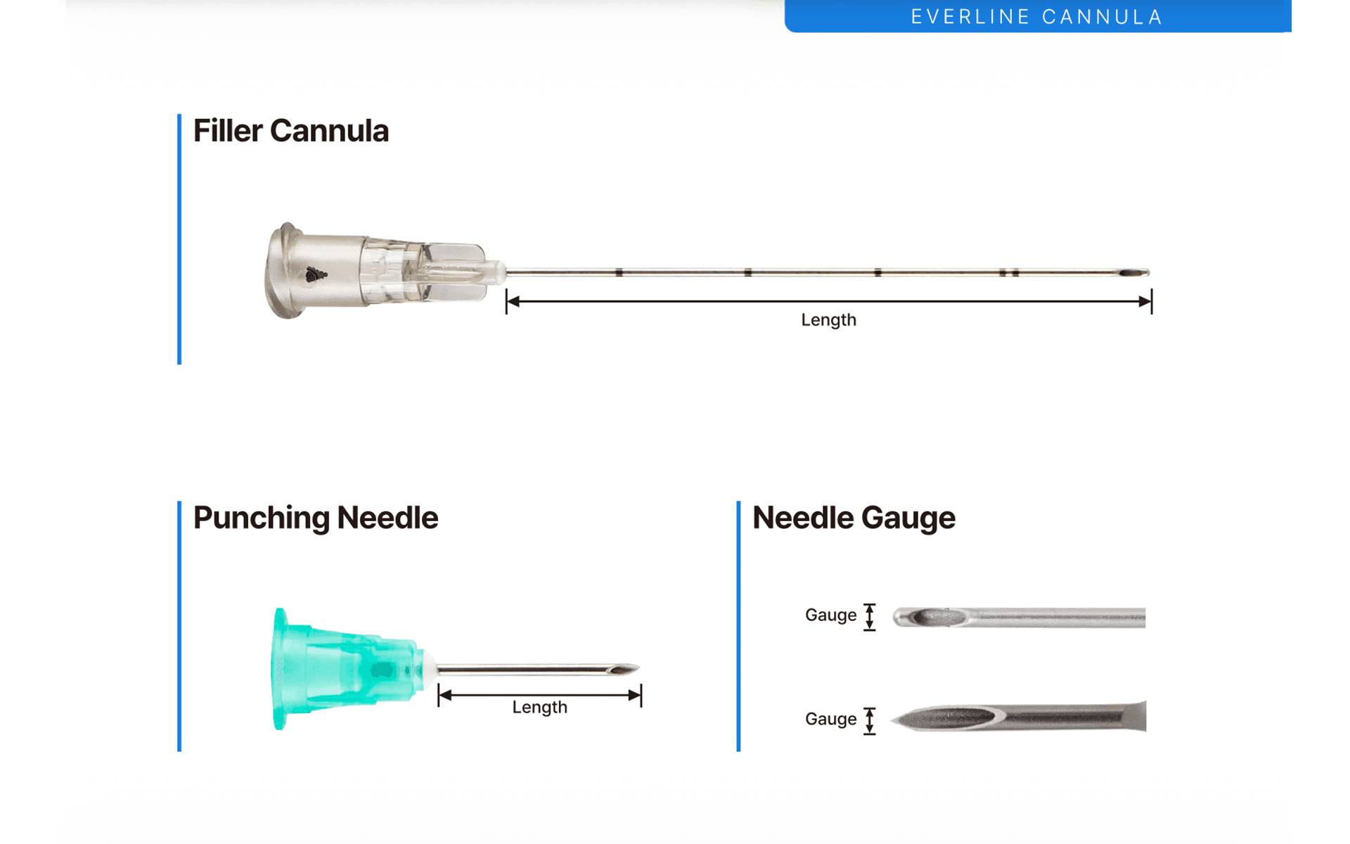 Full Range Cannula & Needle Configuration EVERLINE Cannula is offered in a wide range of specifications and configurations to accommodate diverse treatment environments. It is available in multiple gauges from 18G to 30G and lengths ranging from 25 mm to over 70 mm, enabling precise selection based on treatment area and clinical objectives. The system includes punching needles optimized for each gauge, supporting a consistent workflow from preparation to injection. Its handle and hub design ensure secure attachment to the syringe, allowing stable and controlled manipulation during procedures. This comprehensive configuration establishes a full-range injection system optimized for a wide range of filler treatments.