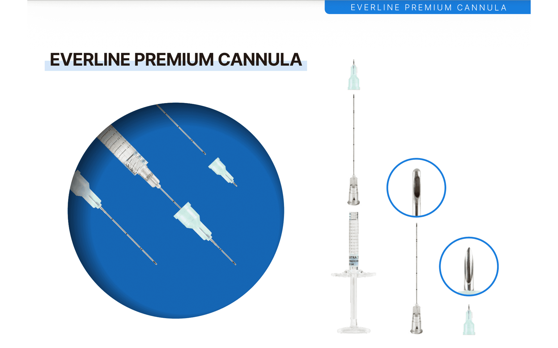 Precision Delivery System for Safe & Efficient InjectionEVERLINE Cannula is a premium cannula system designed to enable safer and more precise injection procedures for fillers and various injectable treatments.Compared to conventional needles, it minimizes tissue trauma while allowing smoother injection and accurate control of placement, enhancing both procedural efficiency and patient satisfaction.With a wide range of gauge and length options, it offers flexible application across the entire face and various treatment areas, serving as a precision injection solution.