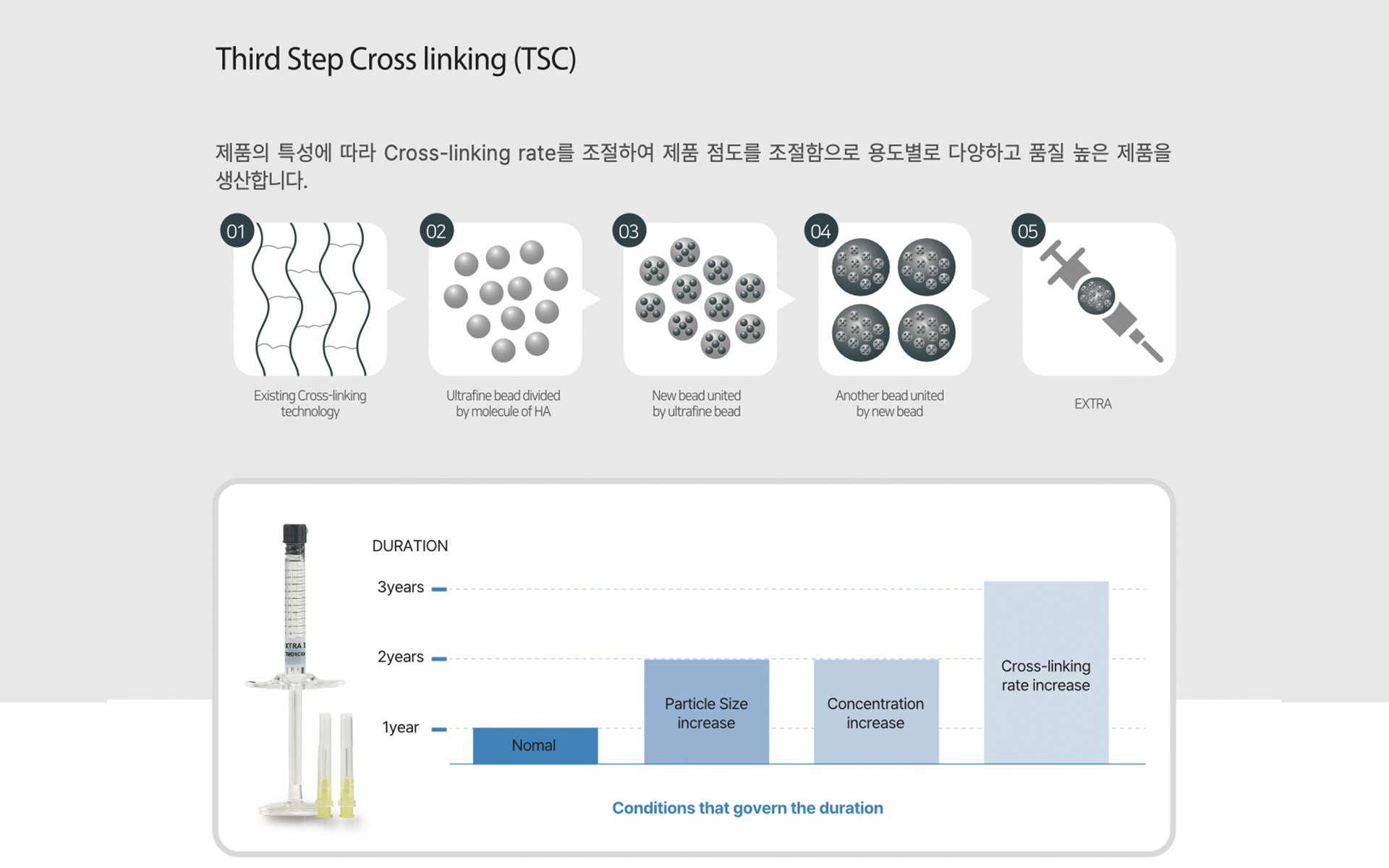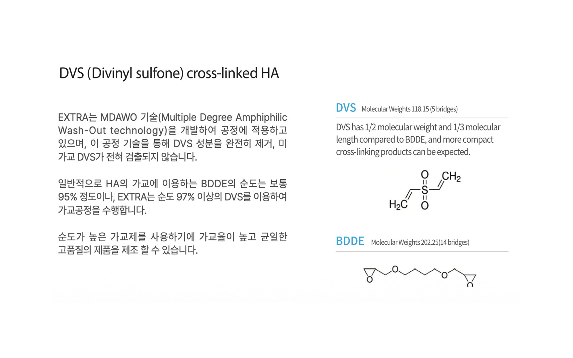 Advanced Cross-Linking & Purification Technology EXTRA is developed based on KLG’s proprietary cross-linking and purification technologies, ensuring high safety and consistent quality through high-purity raw materials and precise manufacturing processes. In particular, the MDAWO (Multiple Degree Amphiphilic Wash-Out) technology is applied to completely remove DVS used during the cross-linking process, achieving a purification level with no detectable residual uncross-linked components. Additionally, the use of cross-linking agents with over 97% purity enables the formation of a uniform cross-linked structure, enhancing product stability and longevity. By precisely controlling the cross-linking rate for each product, viscosity, elasticity, and durability can be tailored to specific treatment objectives, delivering predictable outcomes across diverse clinical environments.