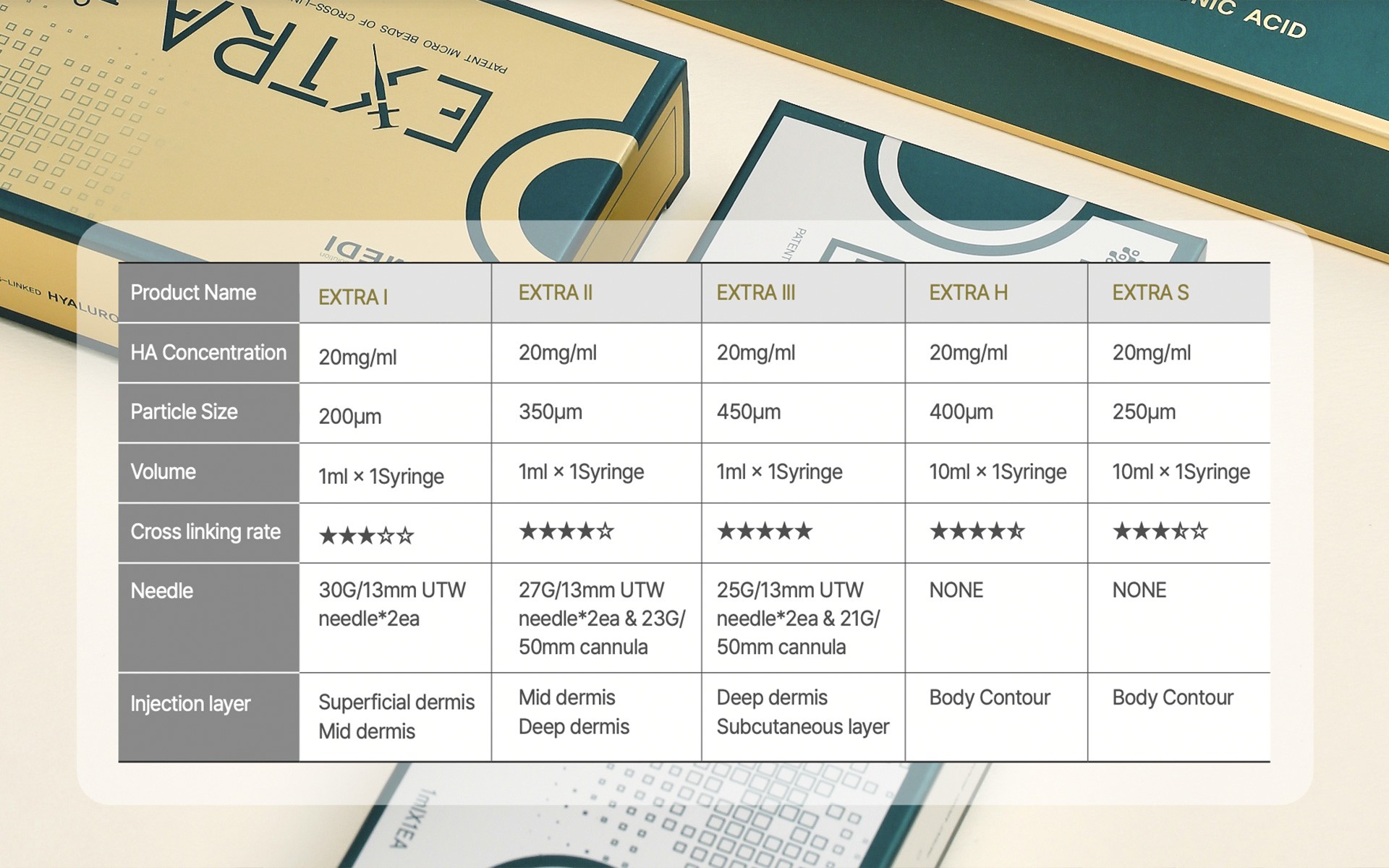 Multi-Layer & Full-Range Application EXTRA is an integrated filler system designed to enable precise treatments through a product structure optimized for different injection depths and clinical objectives. EXTRA I is suitable for superficial to mid-dermal layers, improving fine lines and providing subtle, natural volume enhancement. EXTRA II is applied from the mid to deeper dermal layers, supporting volume restoration and contour refinement. EXTRA III is designed for deep dermal and subcutaneous layers, enabling structural volume augmentation and three-dimensional contour enhancement. The body-specific products, EXTRA H and EXTRA S, are developed for body contouring procedures such as the breast and hips. With a high-volume formulation, they are effective for volume enhancement and line improvement. This structured portfolio delivers a full-range aesthetic solution covering both face and body, expanding practitioner flexibility and enabling precise, consistent treatment outcomes.
