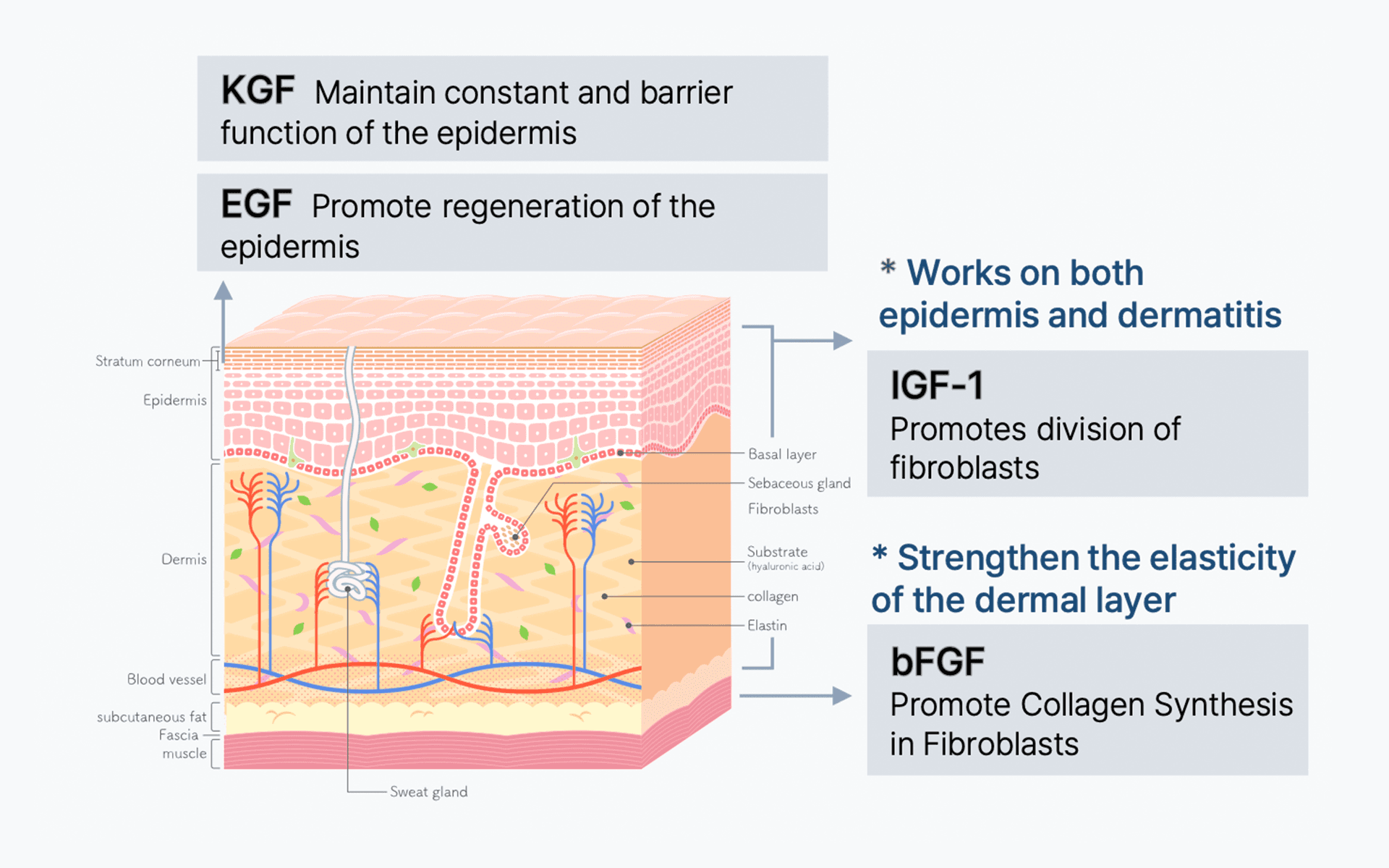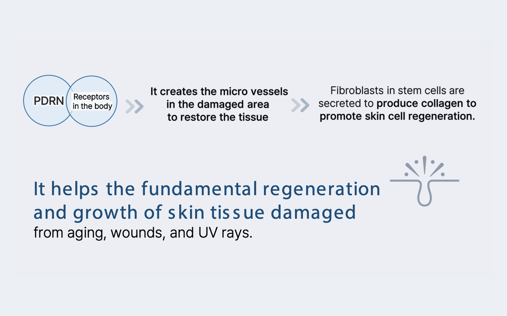 4GF Cellular Activation & PDRN Regeneration Mechanism KMC Ampoule promotes multi-dimensional skin regeneration through the combined action of multiple growth factors and PDRN. EGF contributes to epidermal regeneration and wrinkle improvement, while bFGF stimulates collagen synthesis to enhance skin elasticity. IGF-1 supports cellular growth and recovery, and KGF helps maintain skin barrier function and improve skin density. In addition, PDRN, a DNA-derived ingredient, promotes the regeneration of damaged tissue and supports microvascular formation, accelerating the skin recovery process. Through these synergistic mechanisms, it enhances collagen and elastin production, strengthens the skin barrier, improves elasticity, and overall skin condition.
